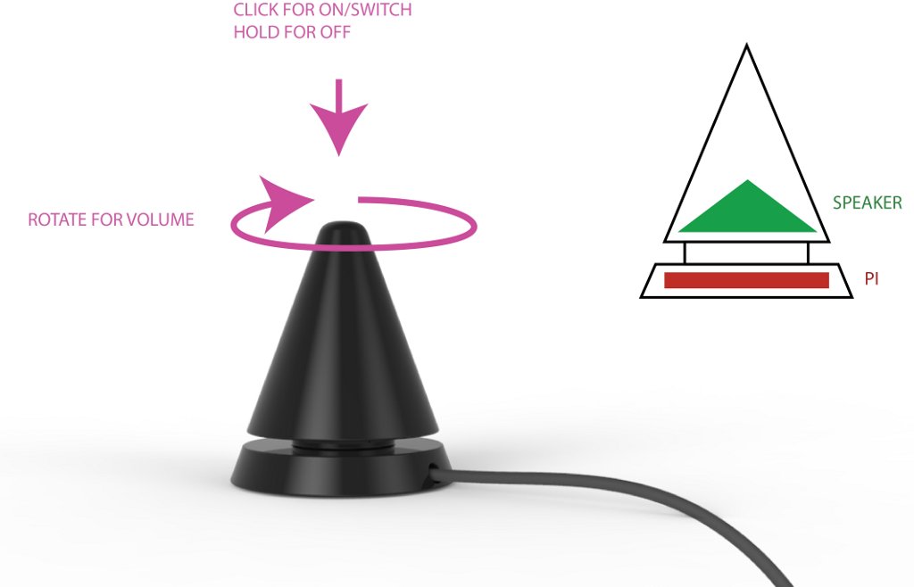 Our first idea was a cone that would rotate for volume and press down for on, next channel, off. A very basic look, and extreamly easy to use. What killed this was the size it would need to be to accomodate an rPi and the mechanical complexity of making the twist and click switch.