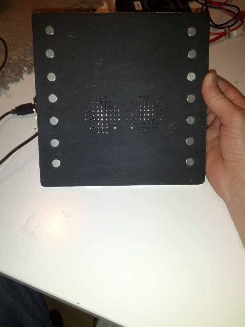 For sound we tore down a Music Angel portable speaker. It gave us two speakers, an amplifier running on 5V and a battery which we threw away. The built in soundcard gave horrible sound under certain conditions, so a cheap USB soundcard was used instead.