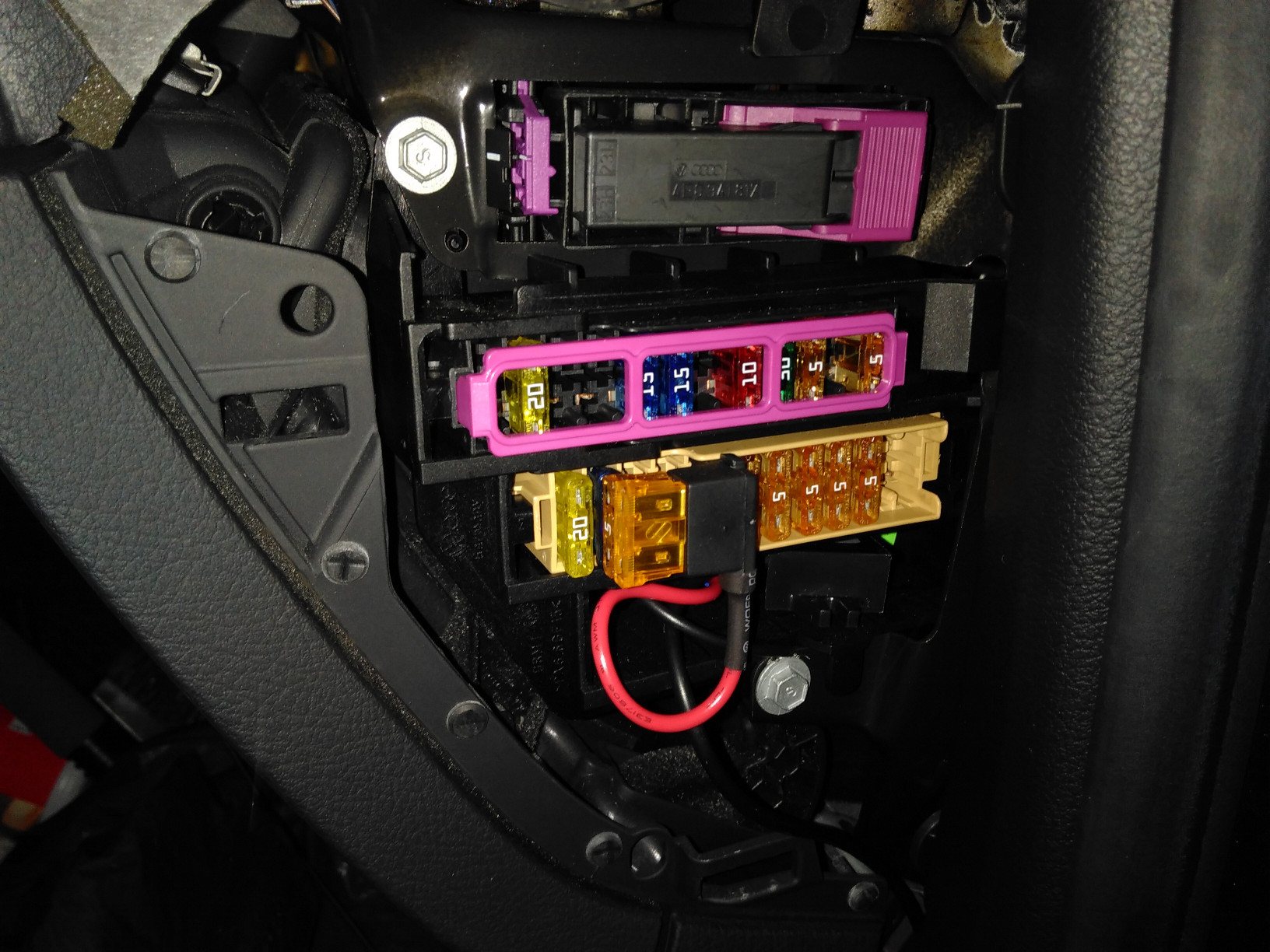 I needed power from the car, but want it to cut off when the ignition is off. My 12 V outlets didn’t. So I used a fuse holder with outlet to accomplish this. To that I attached a 12 to 5 V converter.