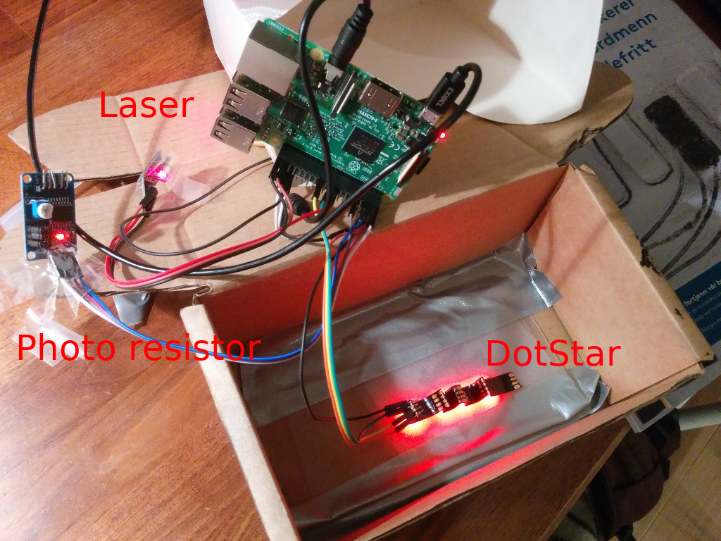 - Laser triggered alarm, which can’t be fooled by using a separate laser or flash light. This is done by pulsing the laser and making sure photo resistor is relatively dark when laser is off.
