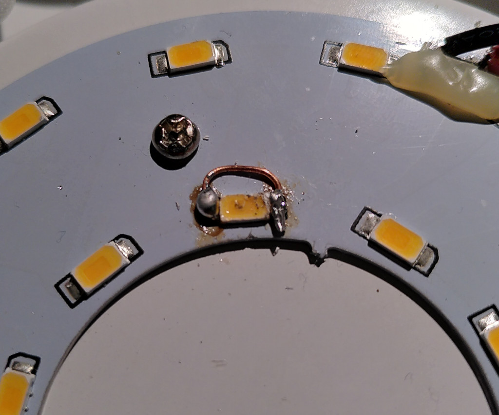 The lamp works again if the broken LED is shorted. This “repair” is only for testing. I do not suggest using a lamp in this state.