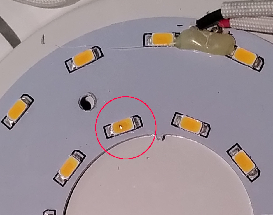 The broken LED is apparent with a small mark on it.